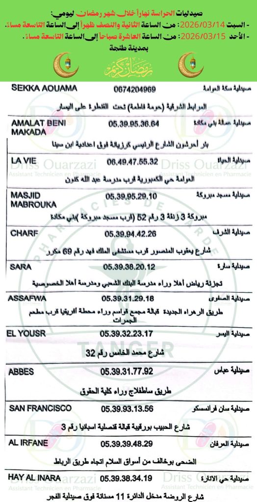 صيدليات الحراسة ليومي السبت والأحد بطنجة مكتب طنجة 14 مارس, 2026 في إطار الخدمات التي تقدمها صحيفتكم “الشمال بريس”، تعرض عليكم صيدليات الحراسة بمدينة طنجة ليومي السبت والاحد 14 و 15 مارس 2026. شاركه مع أصدقائك tweet