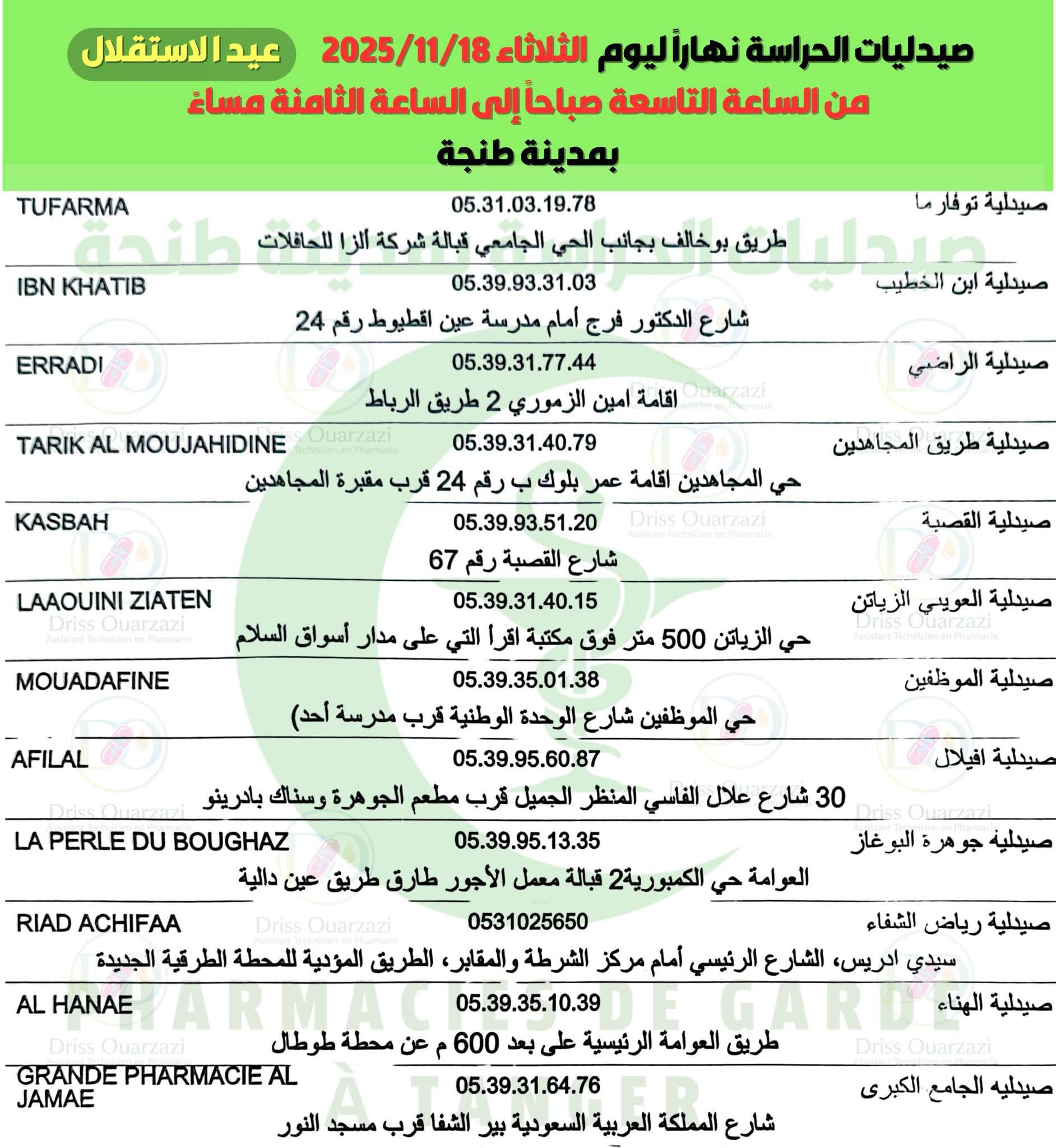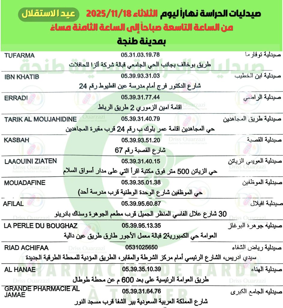 صيدليات الحراسة ليوم عيد الاستقلال بطنجة مكتب طنجة 18 نوفمبر, 2025 في إطار الخدمات التي تقدمها صحيفتكم “الشمال بريس”، تعرض عليكم صيدليات الحراسة بطنجة لعيد الاستقلال 18 نونبر 2025. شاركه مع أصدقائك tweet