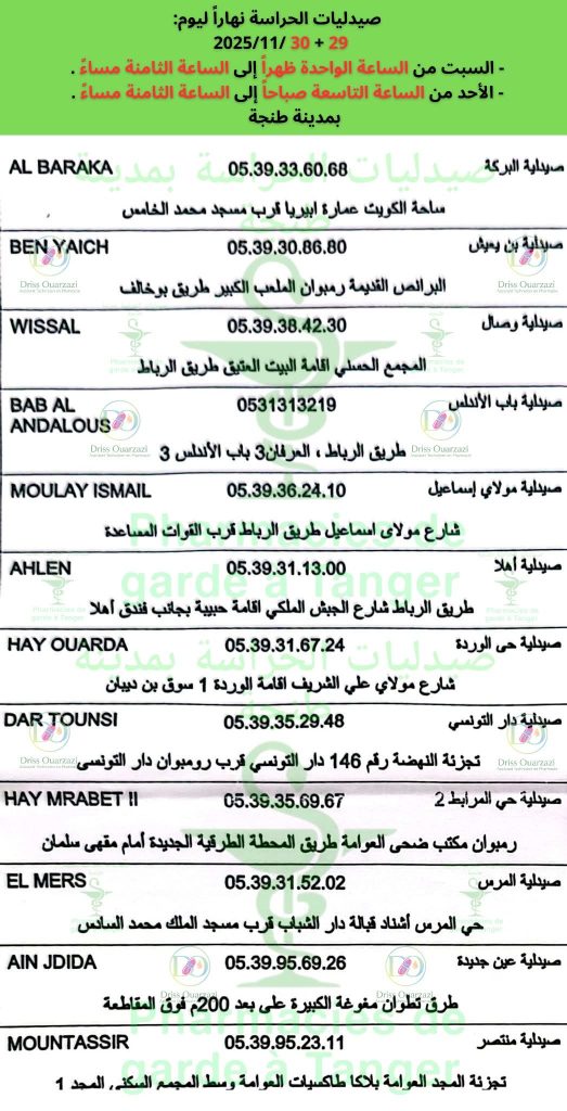 صيدليات الحراسة ليومي السبت والأحد بطنجة مكتب طنجة 29 نوفمبر, 2025 في إطار الخدمات التي تقدمها صحيفتكم “الشمال بريس”، تعرض عليكم صيدليات الحراسة بمدينة طنجة ليومي السبت والاحد 29 و30 نونبر 2025. شاركه مع أصدقائك tweet